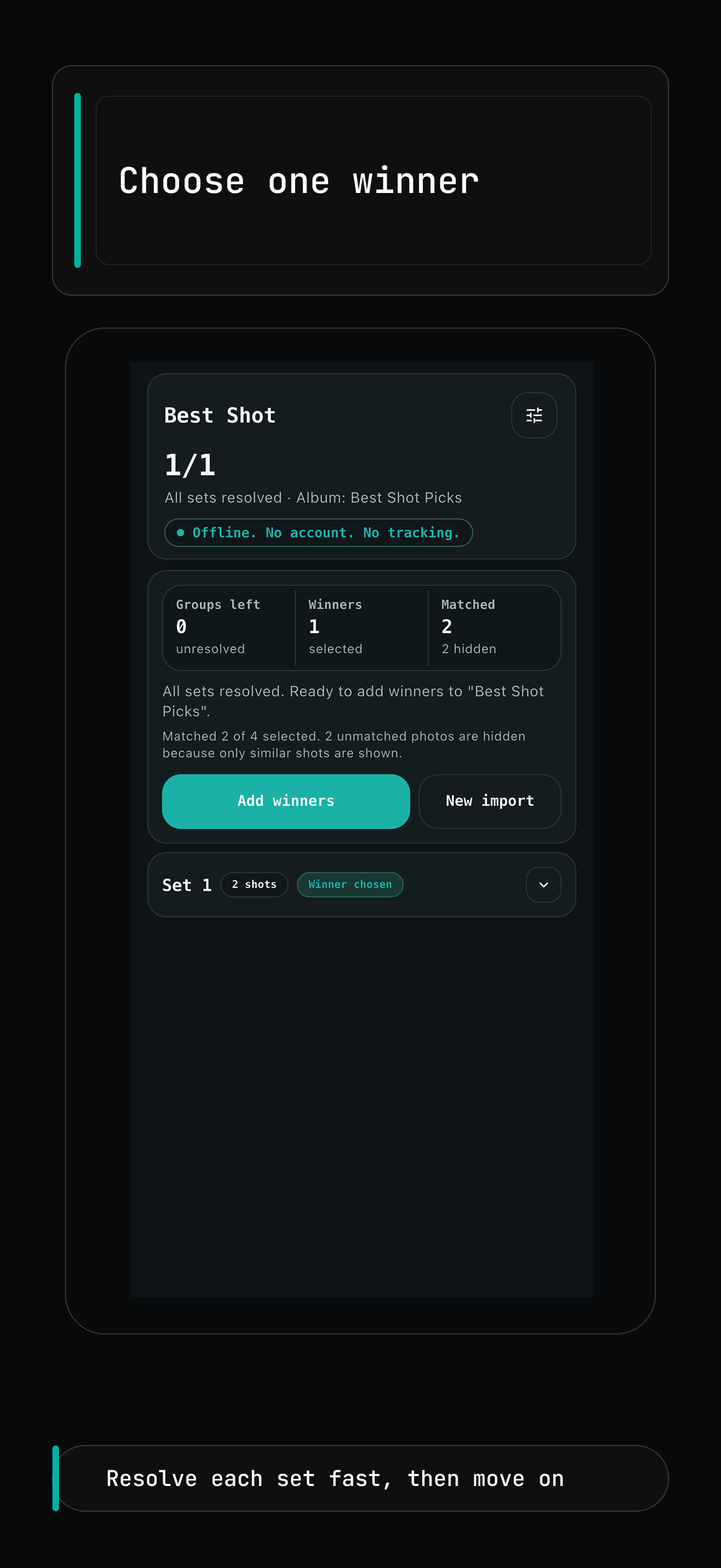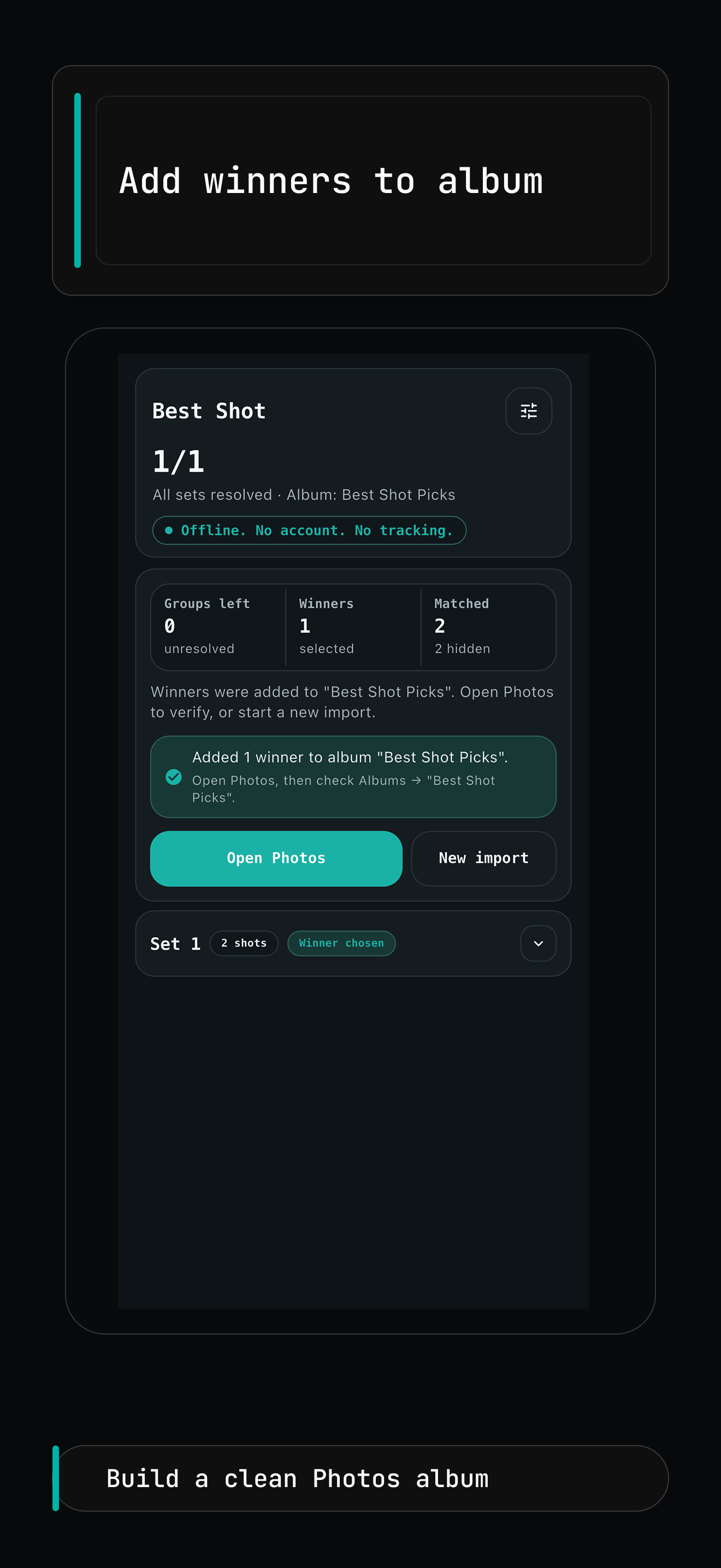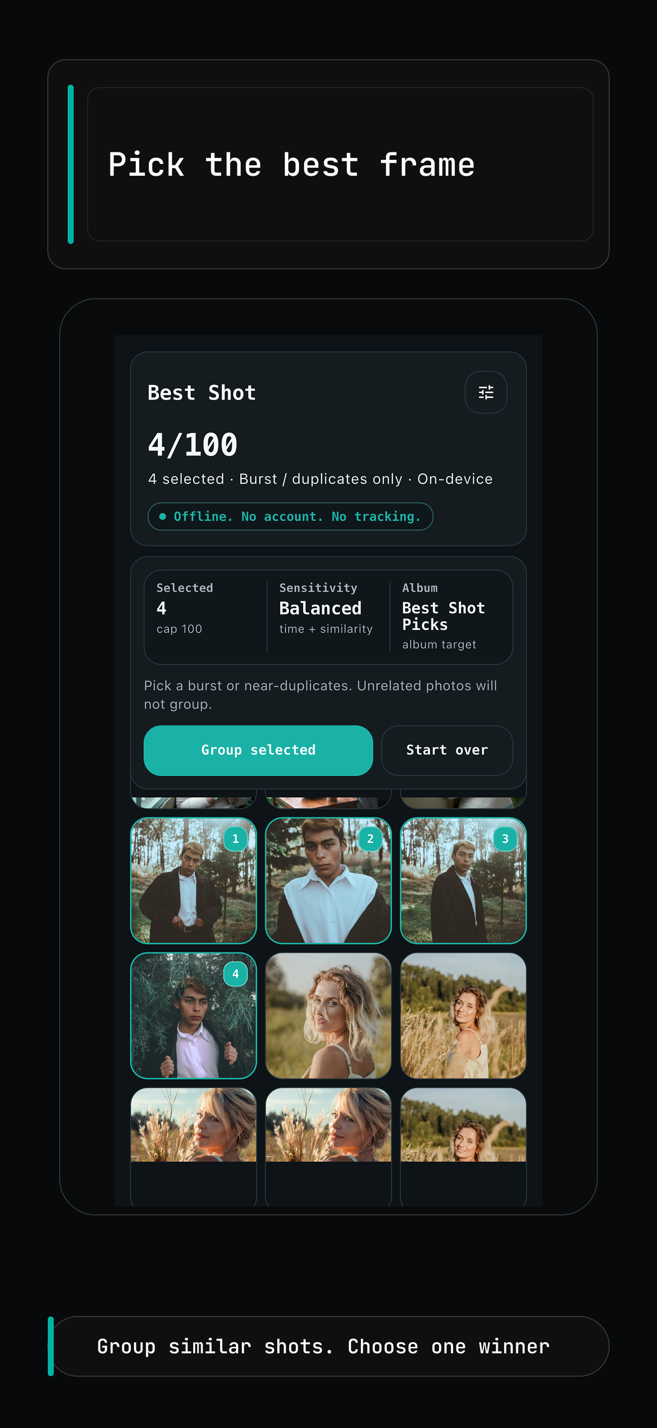 Best Shot groups bursts and near-duplicate photos on device so you can compare faster, keep one winner per set, and export your picks to a Photos album.
