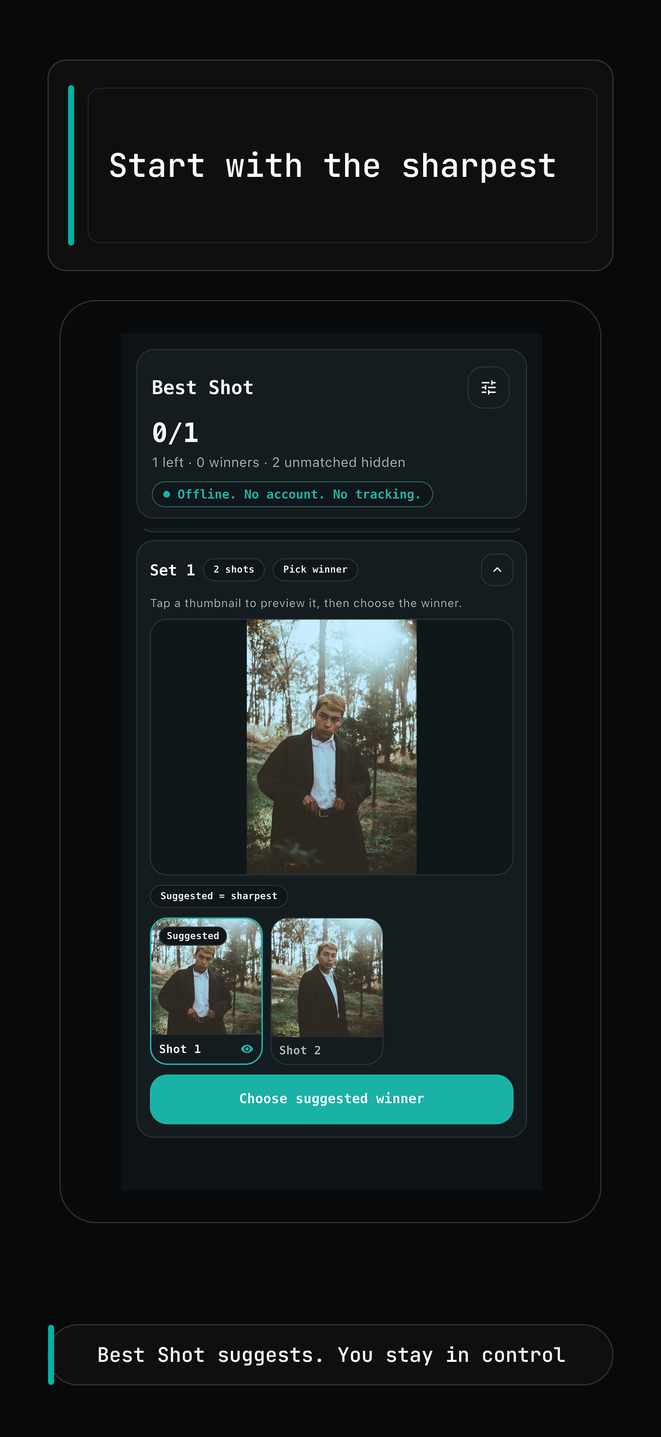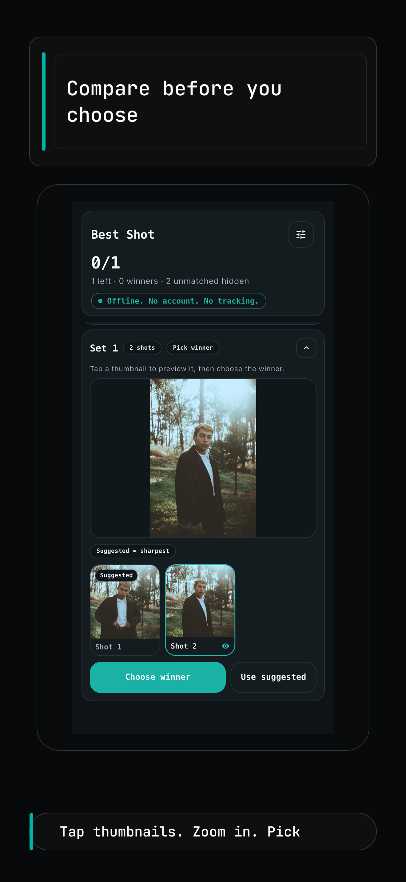 Best Shot keeps the workflow narrow: group related photos, compare quickly, and move on after one clear pick.