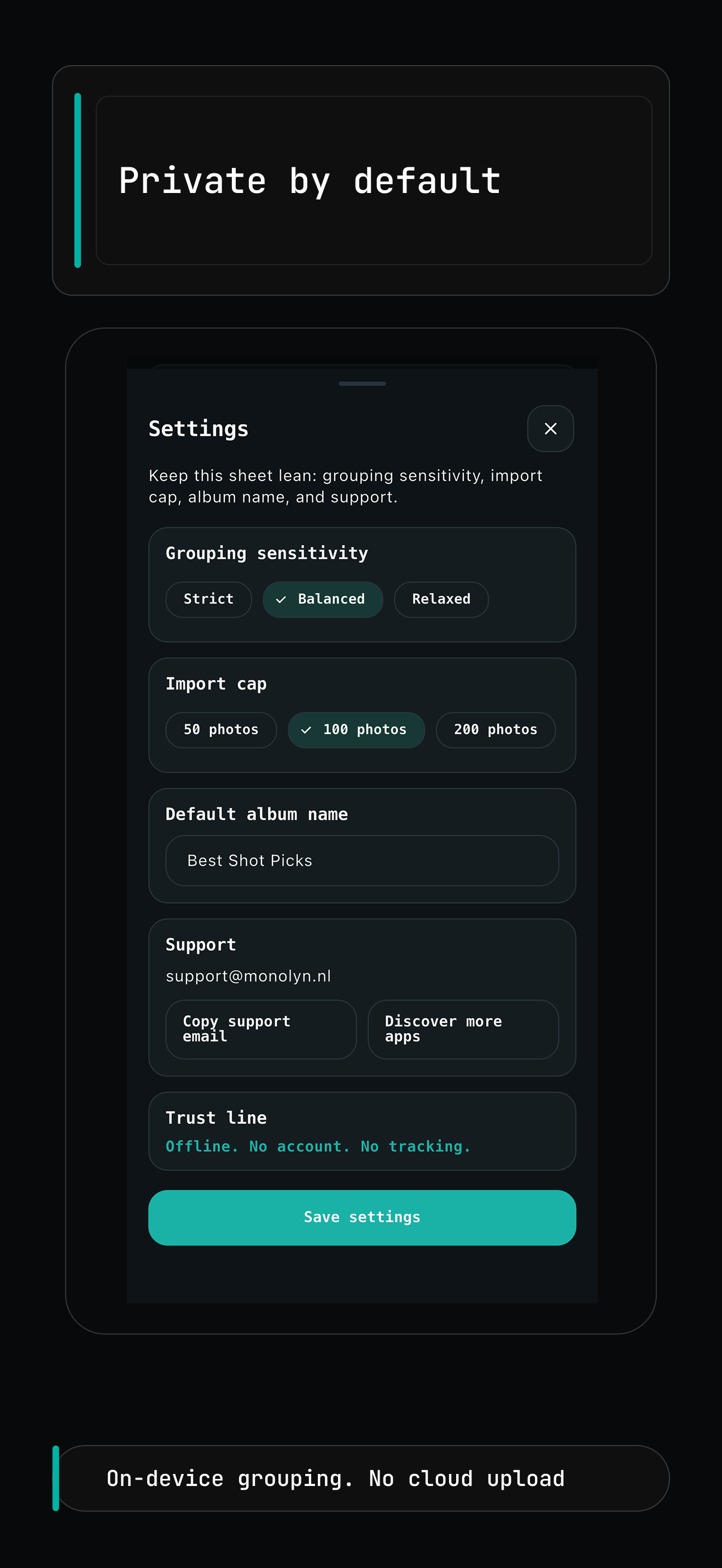 Keep grouping on device with no account and no cloud upload.